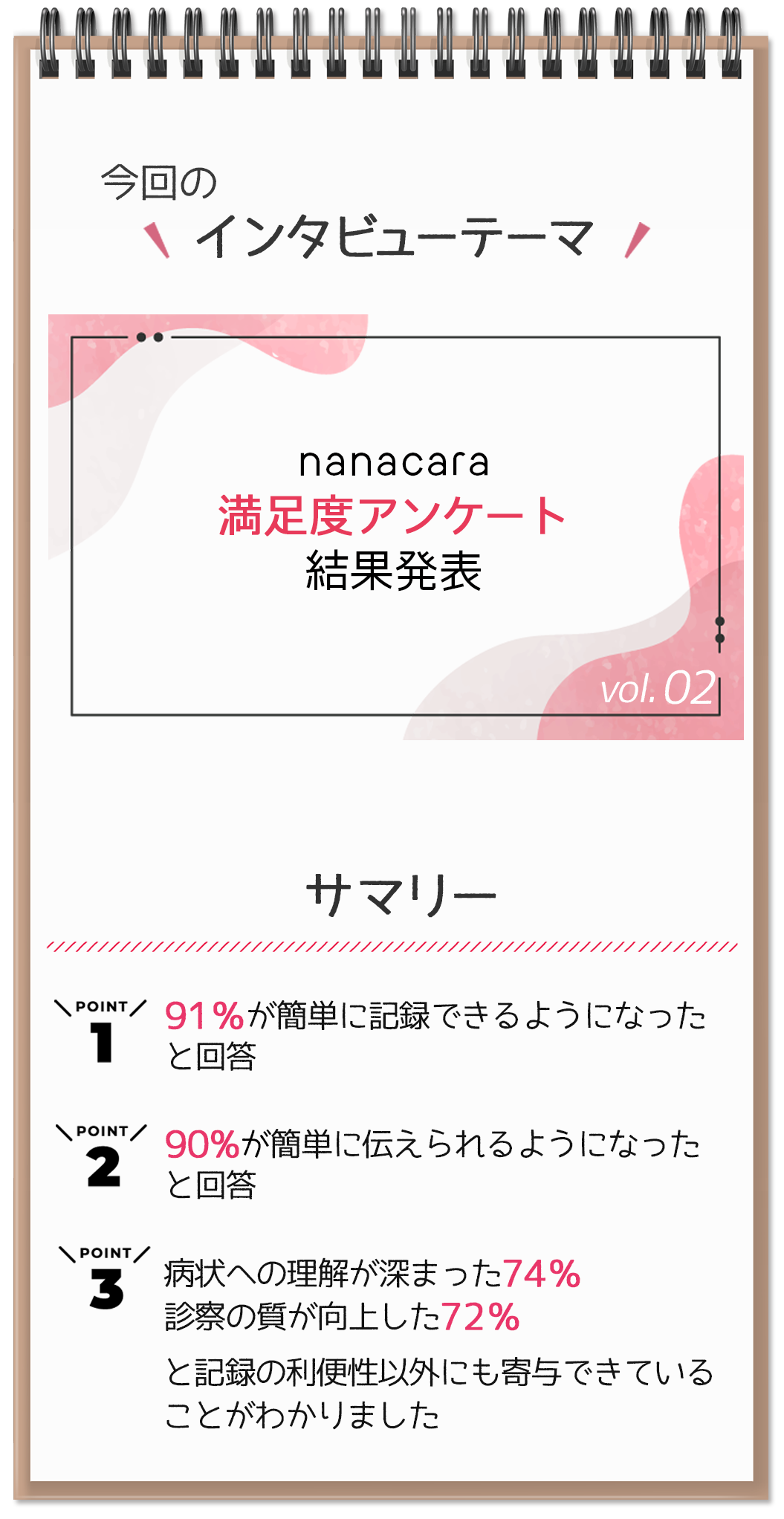 nanacaraは患者、ご家族、医師はじめご支援者の皆様と共に創り上げていくソリューションです。5年目を迎え、皆さんのご意見をもっとお伺いできる場、お伺いしたご意見をみんなで共有できる場、そのご意見をどうする予定なのかをお伝えする場、など場作りにも注力していきたいと考えています。