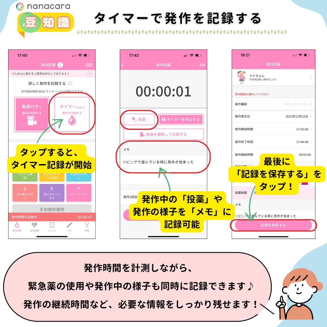 「タイマーのみで発作を記録する」をタップ。タイマーでの記録が開始されます。