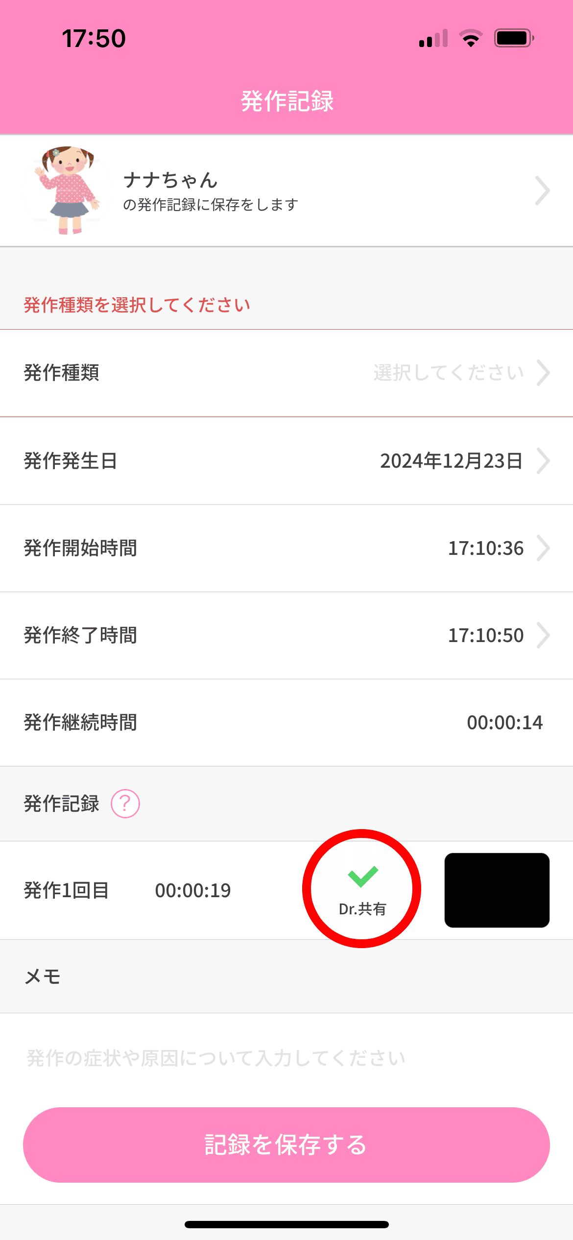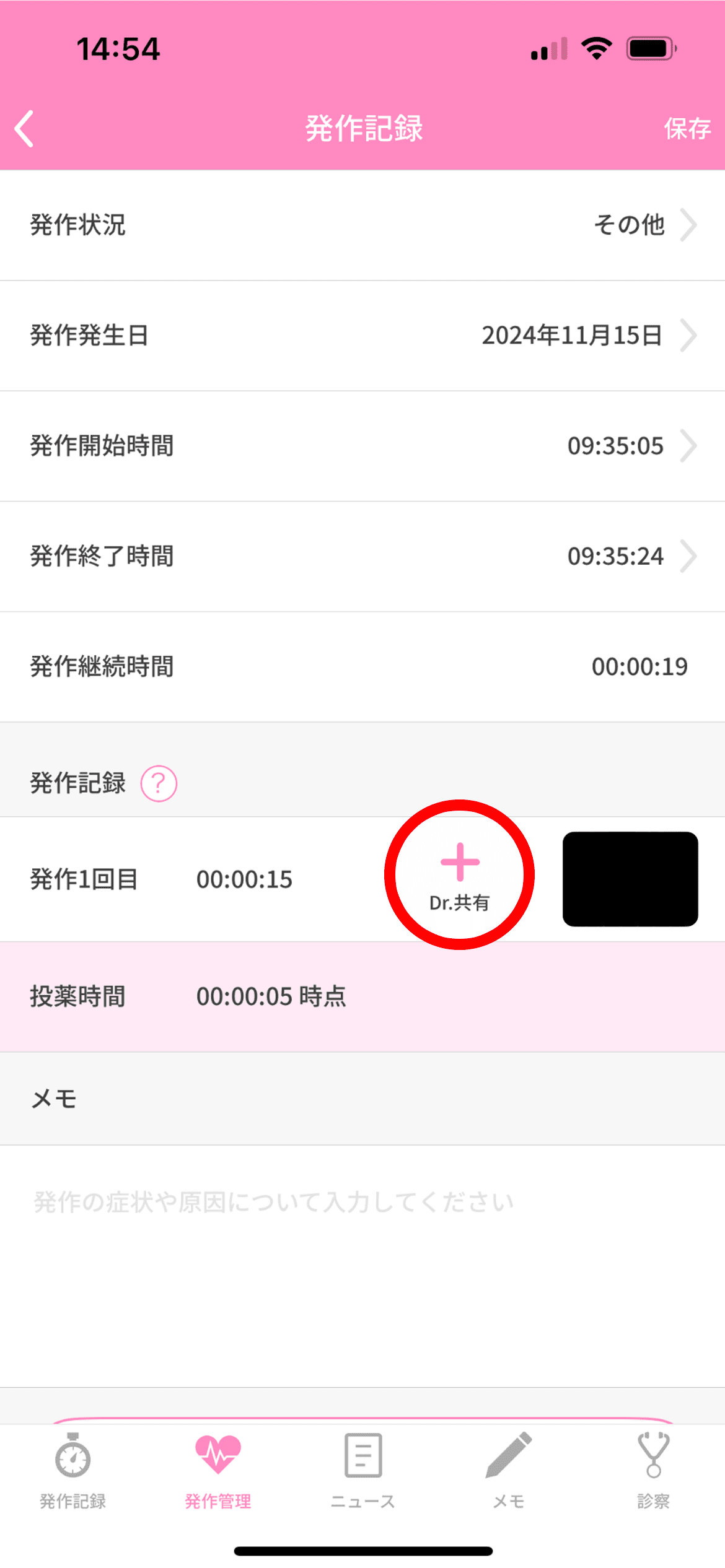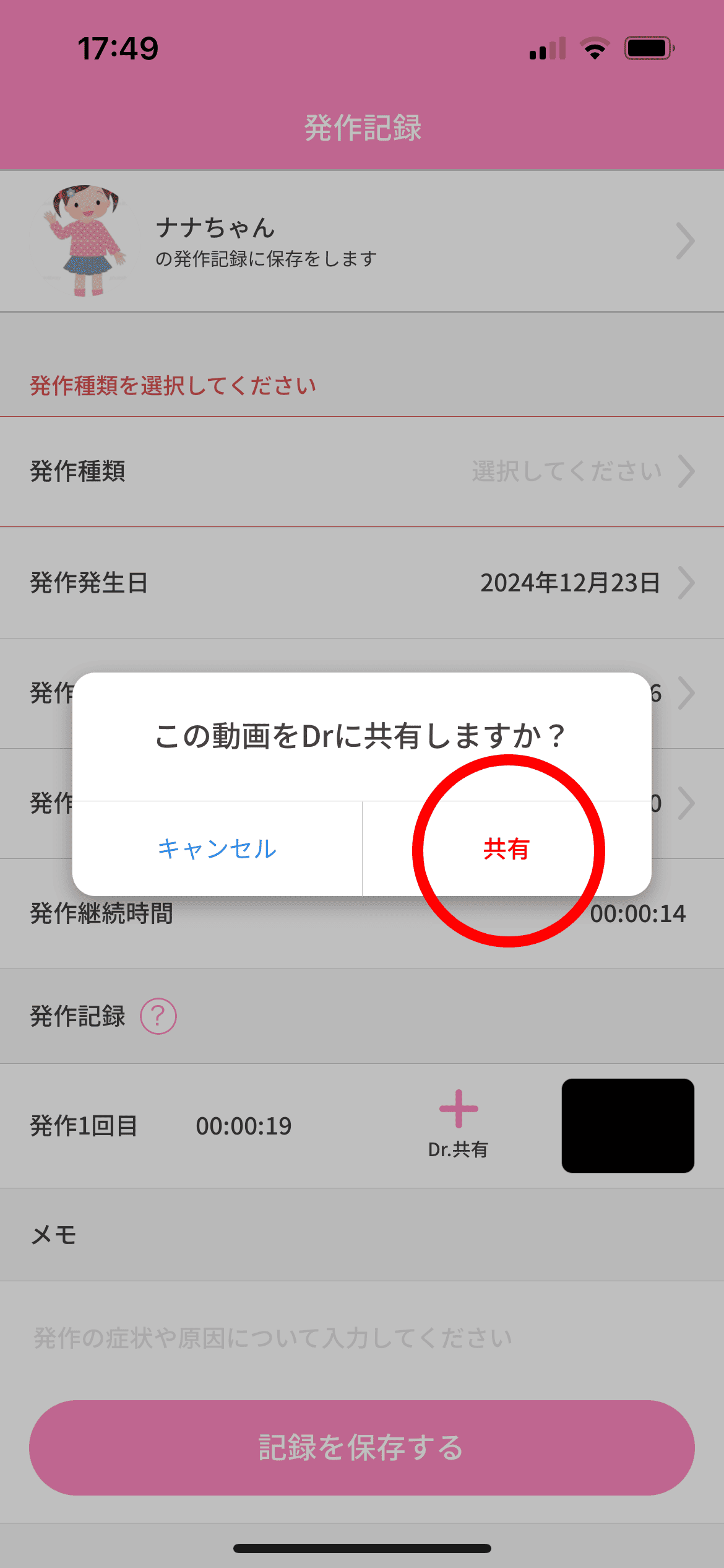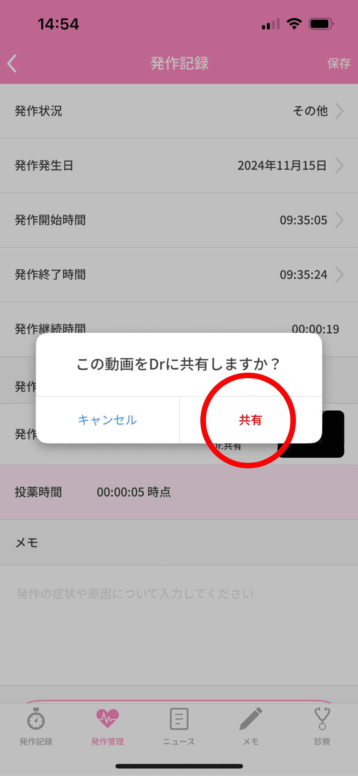 発作記録の画面中央にある+マークをタップすると「この動画をDr.に共有しますか?」と表示されます。