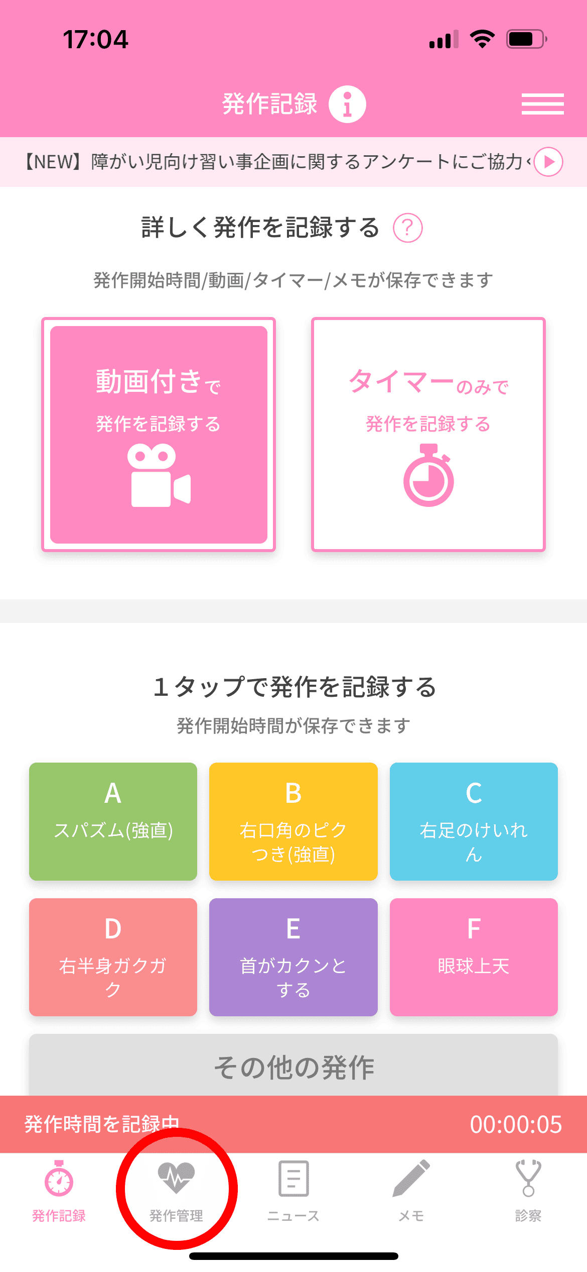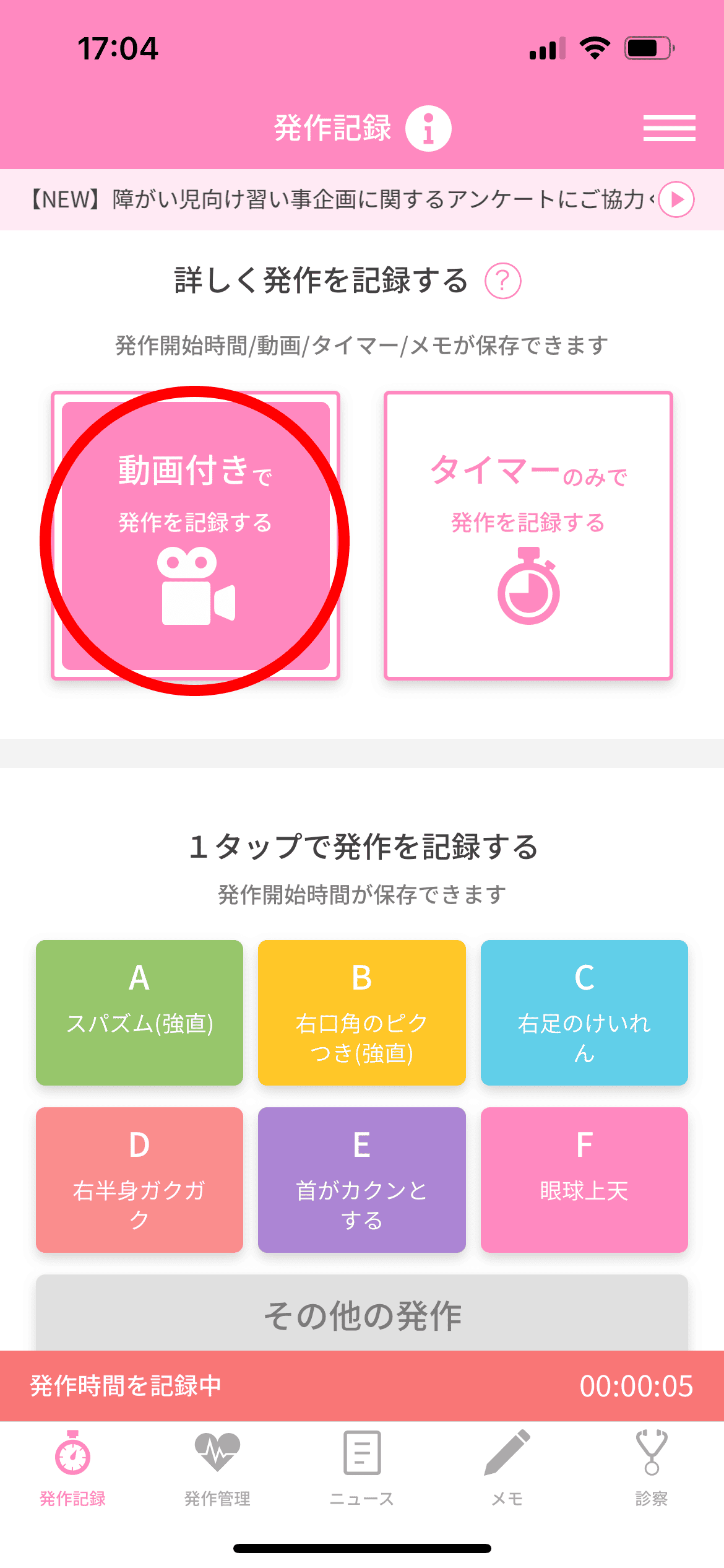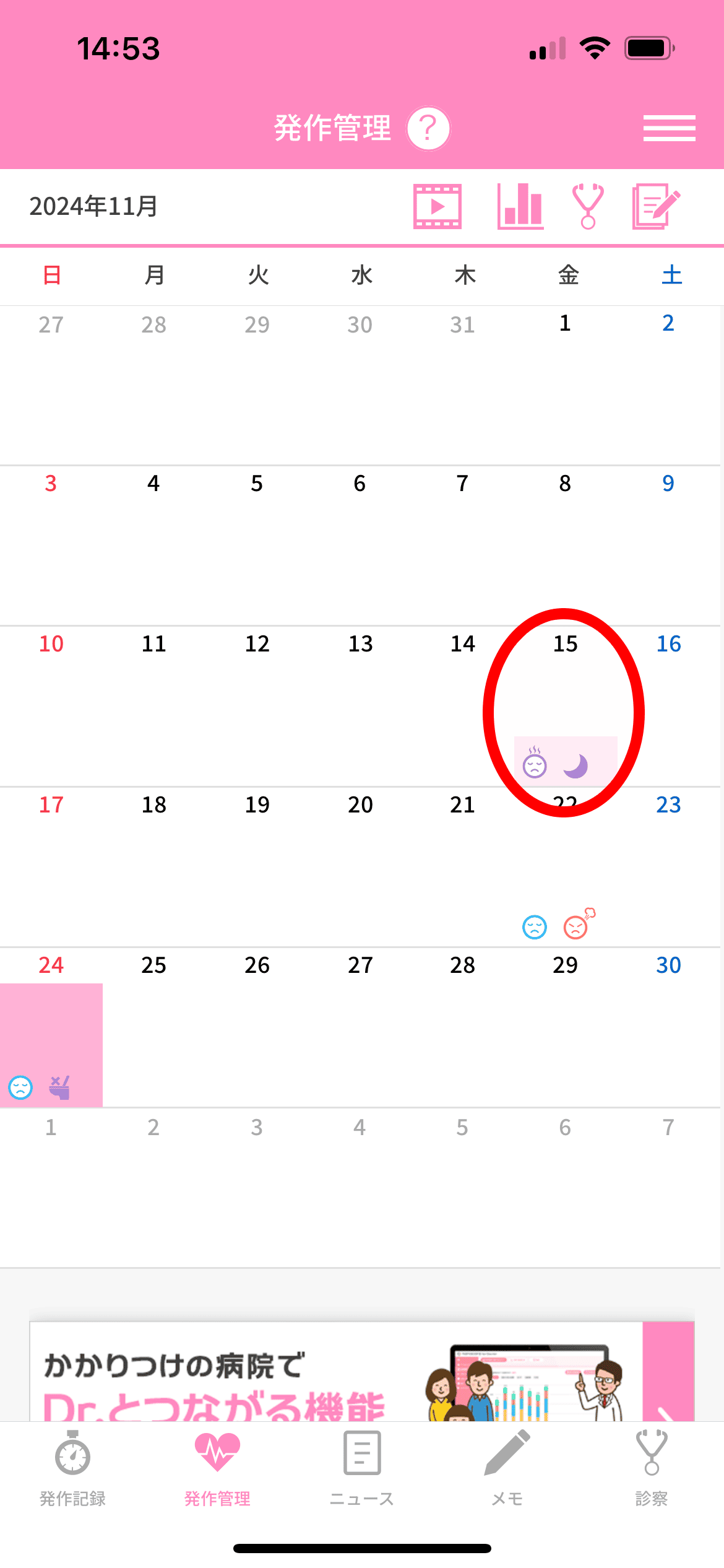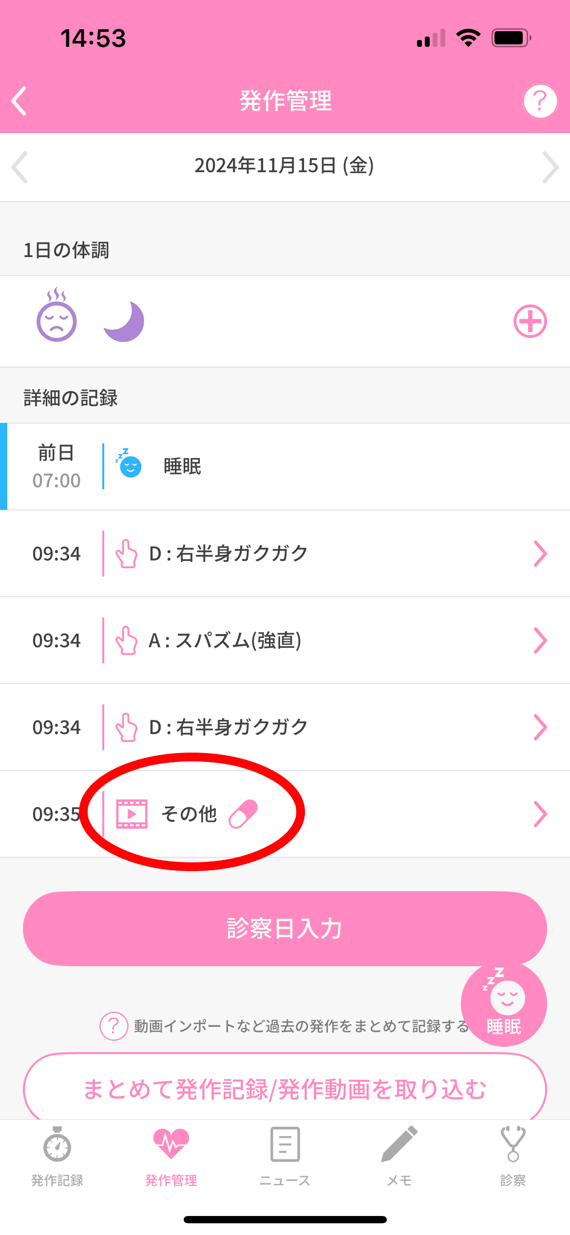 発作記録の画面中央にある+マークをタップすると「この動画をDr.に共有しますか?」と表示されます。