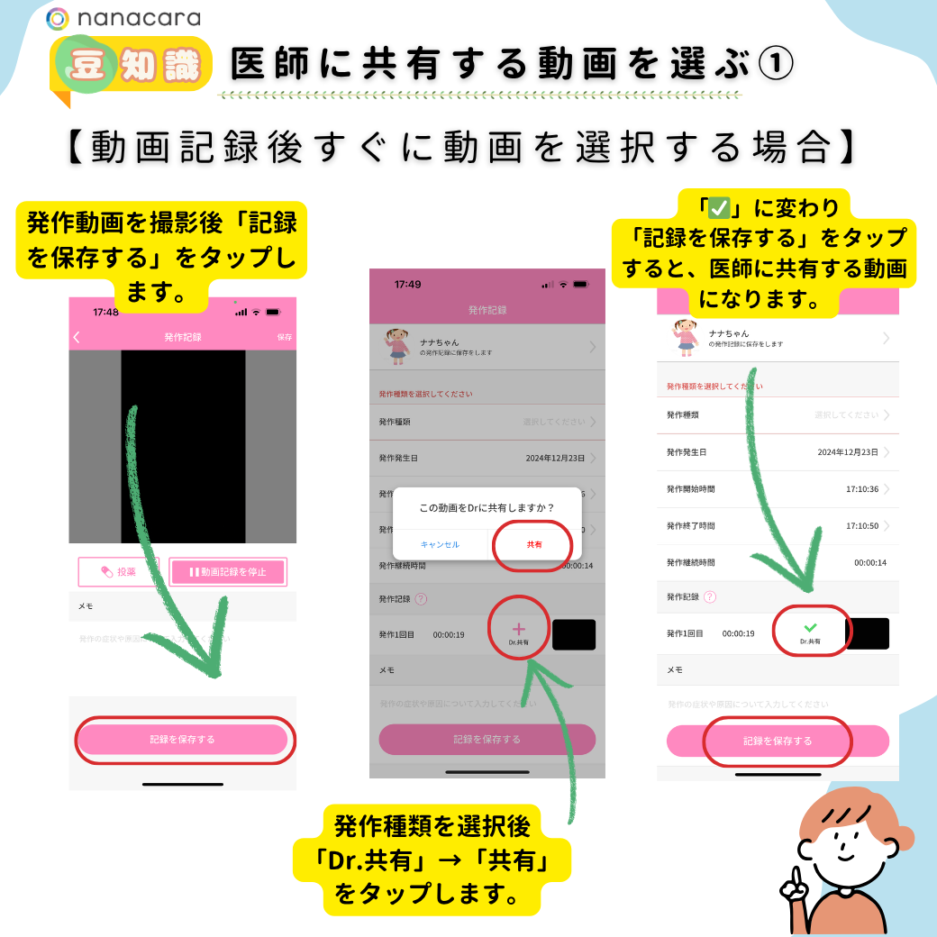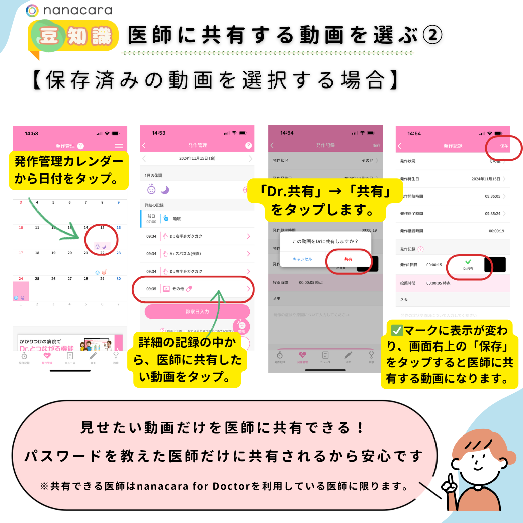 nanacaraに記録した動画を、診察時に主治医と共有することができます。
